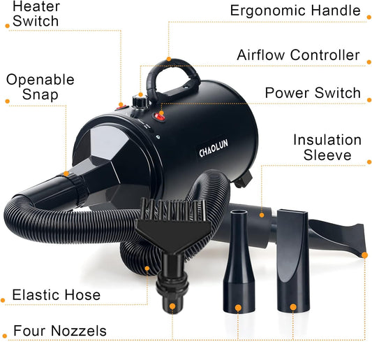 High Velocity Dog Grooming Dryer, Dog Blow Dryer, Pet Hair Dryer with Heater, Adjustable Speed, Black