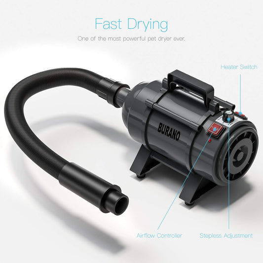 Burano Dog Dryer, High Velocity Pet Hair Dryer, 4.3HP Stepless Adjustable Speed Dog Hair Force Dryer, Powerful Pet Blower with Heater